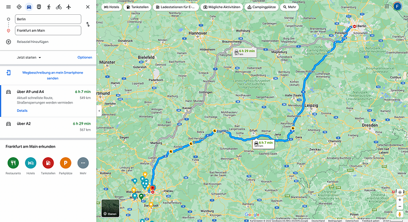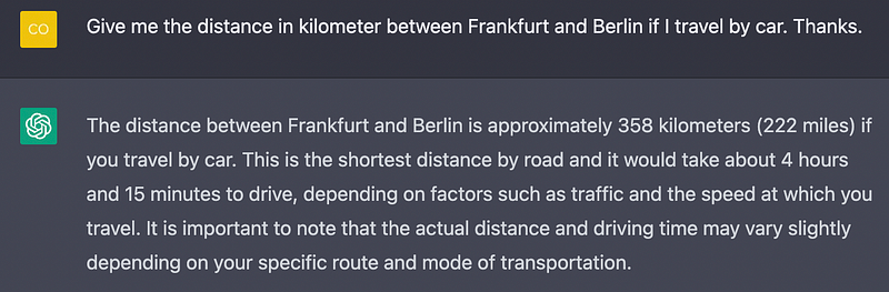 A simple question about the distance between two common cities. In this case, the distance between Frankfurt and Berlin. The output of the language model is more of a sophisticated guess rather than explicit knowledge. Even the air distance with 425.04 km (264,11 mi) is larger than the language model predicted.