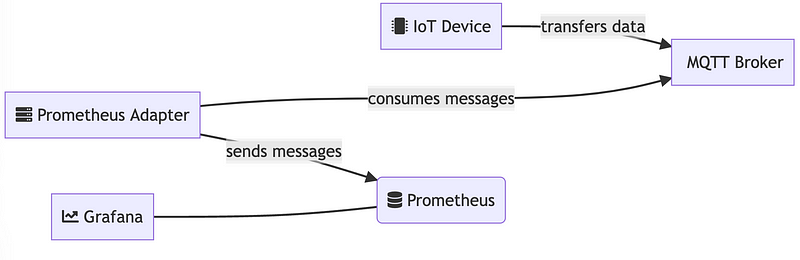 The IoT Device transfers sensor data in a given interval periodically towards a specific topic on a MQTT broker. The topic, which the messages are sent to, has a subscriber. This component is simply there to forward any topic entries towards prometheus. It processes a continues data stream. Prometheus time series database acts in this case like a sink.